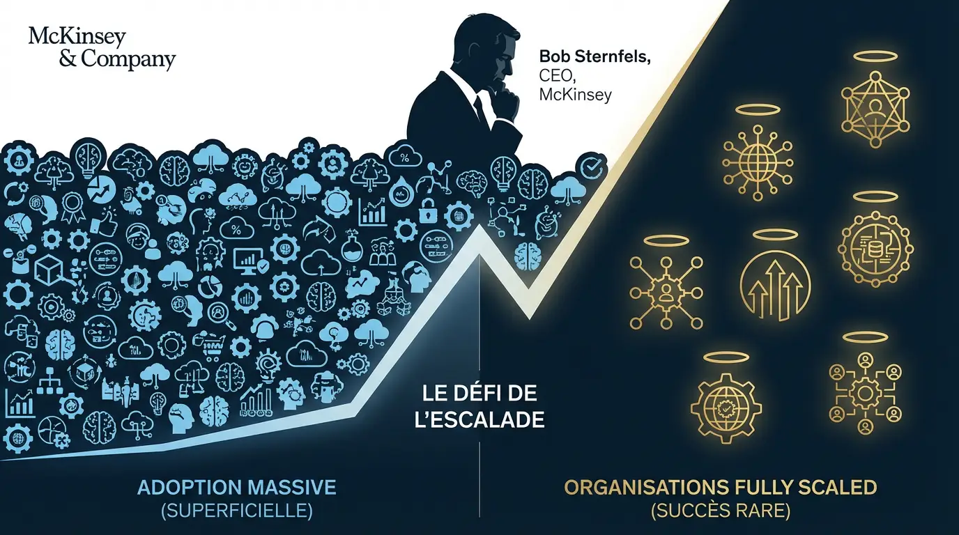 Bob Sternfels, CEO de McKinsey & Company, résume la situation avec une formule chirurgicale : « L’expérimentation est commune, le scaling est rare. » Cette phrase capture l’essence du défi auquel font face les dirigeants en 2025. Car dans cette course à l’intelligence artificielle, ce ne sont pas les premiers à expérimenter qui gagnent, mais les rares capables de transformer l’essai en valeur d’entreprise réelle.