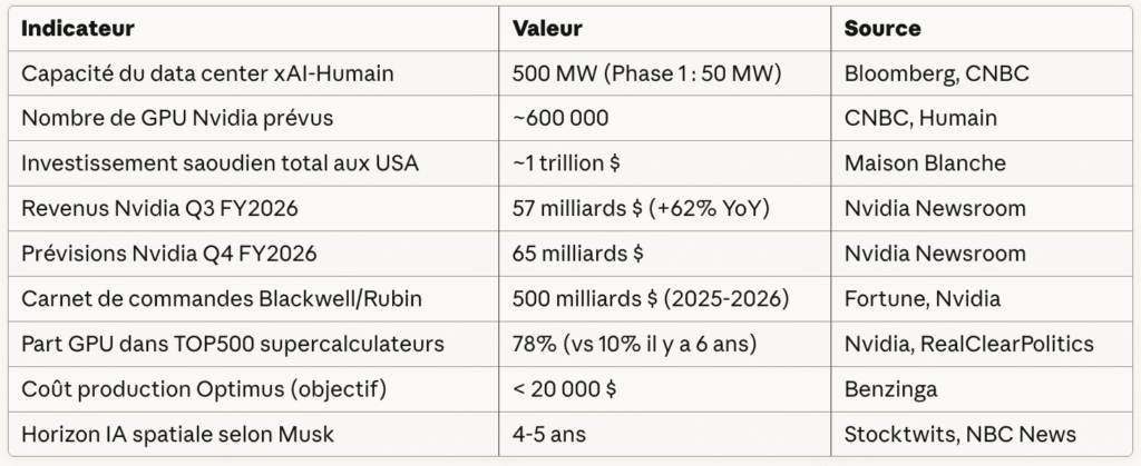 Pendant que certains débattent de l’existence d’une bulle, d’autres construisent l’infrastructure qui définira les décennies à venir. Le data center de 500 MW en Arabie Saoudite, les 600 000 GPU Nvidia, les robots Optimus qui sortiront des usines Tesla, les satellites IA solaires que Musk envisage d’ici cinq ans : tous ces projets représentent des paris concrets sur un avenir où la puissance de calcul devient la ressource la plus précieuse de la civilisation.