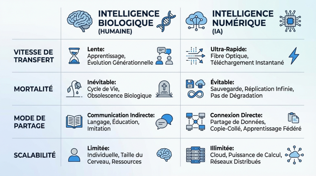 Comprendre l’alarme de Hinton exige de saisir une distinction technique fondamentale. L’intelligence humaine est analogique. L’intelligence artificielle est numérique. Cette différence n’est pas cosmétique. Elle est structurelle.