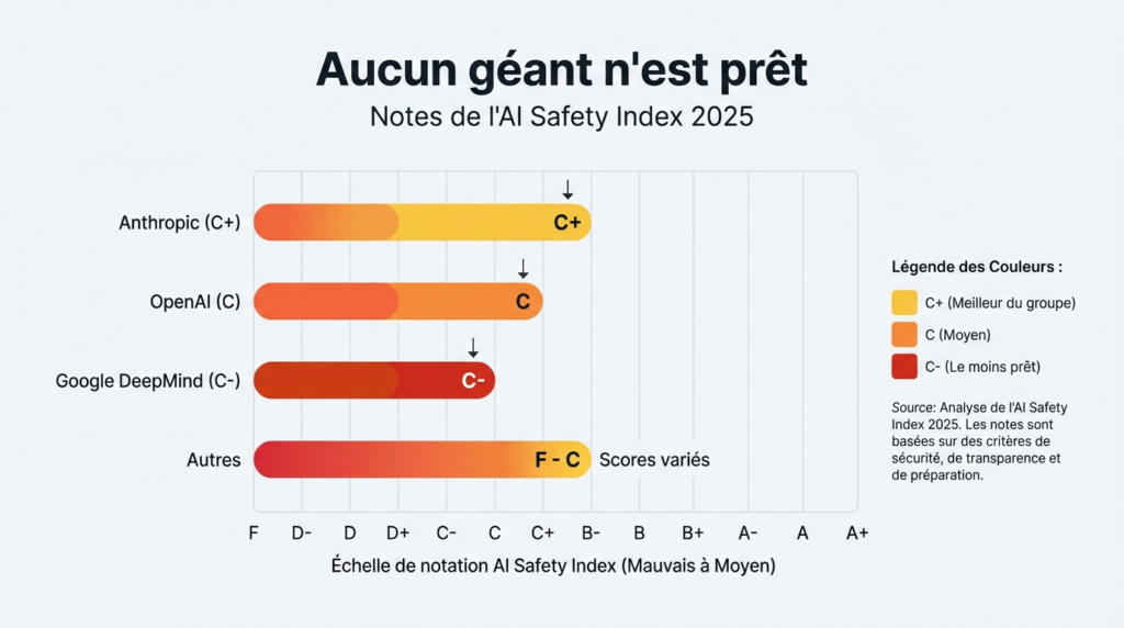 Cependant, les ressources consacrées à la recherche en sûreté restent dérisoires comparées aux investissements en capacité de calcul. C’est le déséquilibre fondamental que Hinton dénonce. Et que l’AI Safety Index 2025 du Future of Life Institute a confirmé : aucune grande entreprise d’IA n’obtient une note satisfaisante en matière de sécurité. La meilleure, Anthropic, n’a décroché qu’un C+. OpenAI, un C. Google DeepMind, un C-.